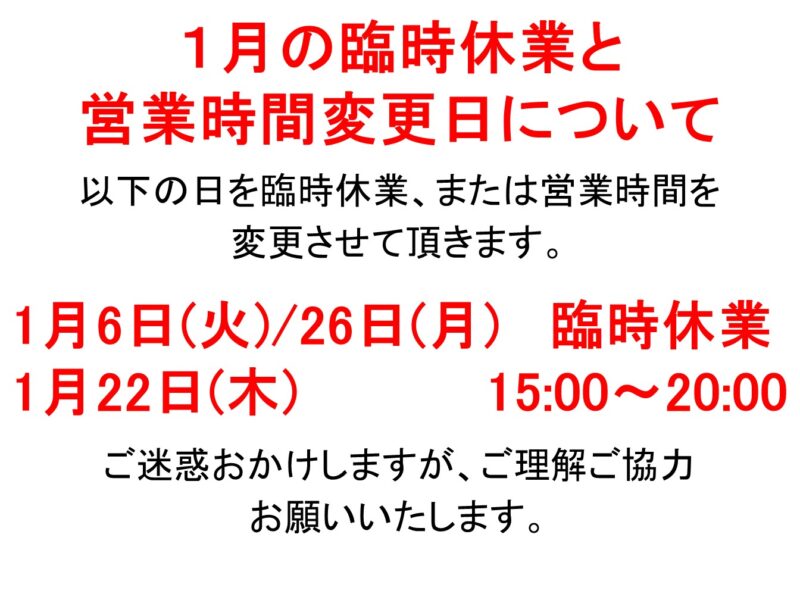 1月の臨時休業日(6日・26日)と営業時間変更日(22日)のお知らせ